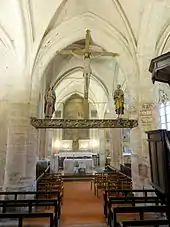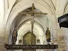 - Le tableau de saint Nicolas au chevet du collatéral sud est flanquée de statues de la Vierge de douleur et de saint Jean de qualité médiocre, qui sont susceptibles de provenir d'une autre poutre de gloire[14].