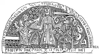 - autour du tympan : JOHES VII ECCLIIS QUE SUNT IN [ASIA VIDI]T FILII HO[MINIS IN]TER VII CANDELABRA AUREA