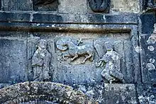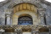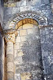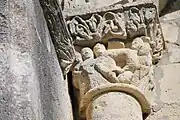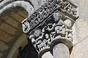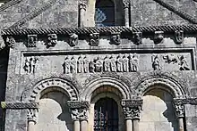 - un bandeau sert d'appui à trois arcades portées par des colonnes sculptées avec la sculpture en relief d'un musicien étrangement plaqué à mi-hauteur sur deux colonnes géminées.