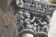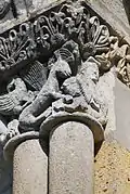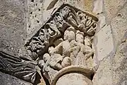 La corniche commune aux trois chapiteaux et le tailloir torsadé du chapiteau central ne sont pas d'origine, ils ont été refaits au XIXe siècle.