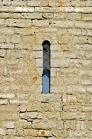 Ses faces latérales sont percées d'une étroite fenêtre à arc monolithe.