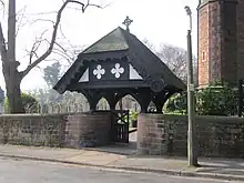 À l'entrée du cimetière se trouve un grand porche orné, conçu par Grayson et Ould, et contemporain de l'église. Il se compose d'un auvent en bois sur un socle en pierre. Le toit est en bardeaux, et les bressumers et rives sont finement sculptés. Au sommet du porche se trouve une croix, classée par English Heritage. Dans le cimetière se trouve un autre mémorial de la Première Guerre mondiale de style Art nouveau, surmonté d'une croix celtique, qui porte l'inscription « Peace », et la date de fin de la guerre[2].