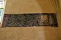 L'ensemble sculpté s'insère entre les deux colonnes-contreforts orientales et à l'aplomb de la baie axiale de l'abside. Il est composé de deux parties : un premier panneau de six personnages, avec une bordure rectangulaire, et, au-dessus, un bandeau allongé avec deux anges nimbés qui volent l'un vers l'autre.