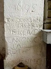- L'inscription relative à la reconstruction de la chapelle et du clocher, près de cette plaque, se lit « 1695 EX DONQ NDL DAVIDIS FRAS THEROUDE ET ARCHI D ROTHM. DNL DA DE WY ». Elle est gravée directement dans le mur, et si sommairement qu'elle s'apparente à un graffiti. Jacques Sirat ne livre pas la signification de tous les éléments. Il est en tout cas question d'une donation faite en 1695 par David Theroulde, chanoine de Beauvais[33].