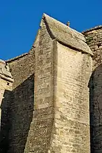 La façade est délimitée latéralement par deux puissants contreforts étrangement asymétriques, celui de gauche étant surmonté d'une couverture en bâtière et celui de droite étant doté d'une couverture en appentis. On notera également que le contrefort de droite est percé à sa base d'une petite porte et présente en hauteur une petite baie carrée ainsi qu'une sorte de "grille d'aération" composée d'une pierre percée de sept trous ressemblant à un petit pigeonnier. Ce contrefort plus épais abrite un escalier en colimaçon conduisant à la toiture.