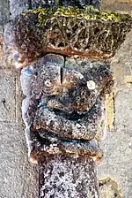 L'arc central, flanqué d'arcs de dimensions plus modestes, est surmonté d'une corniche, supportée par 15 modillons sculptés de figures humaines, de monstres et d'oiseaux.