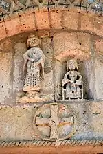 Le tympan : Deux reliefs ont été remployés au centre du parement nu, une statuette de saint Pierre, tenant sa clef et le Livre qu'il serre contre sa poitrine. À côté, dans une niche, une Madone assise et portant Jésus. Le costume porté par Marie, avec ses larges manchettes est typiquement roman. Ce type de représentation est nommé Trône de Sagesse ou Sedes sapientiae. Une représentation semblable est visible dans l'église Notre-Dame d'Espiet.