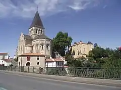 Construite sur un promontoire rocheux qui domine le Lay[3], l'église est de style roman. Sa façade principale, restaurée au XIXe siècle arbore une architecture néo-romane[3].