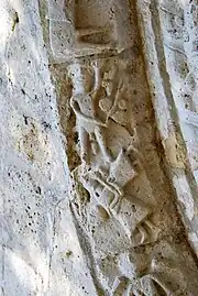 Le couple de la deuxième scène se promène, main dans la main. La jeune femme, dont le visage a été martelé, est reconnaissable à ses deux petits seins. Autour de son poignet gauche, est enroulé un bandeau ou une écharpe. Son chevalier servant tient son destrier de la main gauche. Le cheval est harnaché comme à la fin du XIe siècle : l'arçon (une partie de la selle), l'étrivière courte et l'étrier sont parfaitement identifiables.
