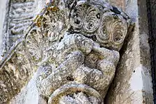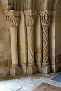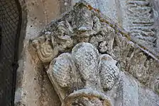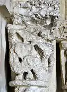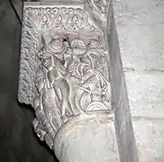 Six chapiteaux romans, dont deux sont historiés, soutiennent la corniche. Du sud au nord : feuillage d'acanthes, lions et dompteurs, acanthes, les quatre dogues, pignes, acanthes.