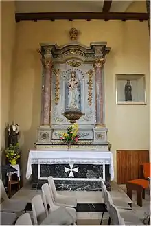 Le retable du transept gauche, qui est de la même époque et du même style que le précédent, est dédié à la Vierge, celle-ci portant l’Enfant Jésus. Ce retable présente les caractéristiques du retable lavallois[a 1]. La niche est encadrée par deux colonnes corinthiennes et surmontée d'un fronton en arc de cercle.