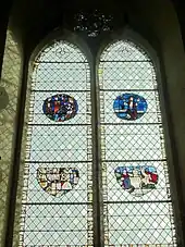 - Les deux autres médaillons du XIIIe siècle se situent en haut des lancettes, et mesurent environ 50 cm de largeur et 40 cm de hauteur. Ils représentent un Christ bénissant et l'Adoration des Mages.