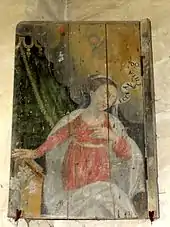 - Les trois panneaux peints représentant saint Sébastien avant son martyre, attaché nu à un arbre (plutôt que le Christ aux outrages) ; un saint évêque (peut-être saint Sulpice) ; et saint Pierre, tenant une clé surdimensionnée et accompagné d'un coq (plutôt qu'un saint personnage non identifié) ; mesurent 140 cm de hauteur et 120 cm de largeur avec le cadre, et datent de 1645. Cette date se lit sur le cartouche en bas du cadre du tableau de saint Sébastien. Au même endroit, les deux autres cadres affichent les initiales S.S. et S.E. Seul le tableau de saint Sébastien, accroché près des fonts baptismaux, est bien conservé. Les deux autres flanquent le chevet, et sont à moitié effacés. Les cadres ne sont pas sculptés, mais seulement peints, avec des rinceaux végétaux de goût baroque, qui sont identiques sur les trois panneaux. Sauf sur le tableau de saint Sébastien, s'y ajoute un rang de volutes, et les bordures sont découpées le long des motifs. L'ensemble des trois panneaux est inscrit depuis septembre 1991[28].