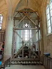 La clé de voûte de la seconde travée du collatéral nord conserve une inscription tracée au crayon par un restaurateur, « Milly Ernest Jullien [sic] le 26 mai 1875 ». — L'église est classée aux monuments historiques par arrêté du , à l'exception de la nef (et certainement aussi de son bas-côté)[2]. Sous l'impulsion de l'architecte en chef des monuments historiques Jules Formigé et l'inspecteur Pierre Paquet, plusieurs tranches de restauration sont entreprises par la suite, mais les délais entre le premier projet et l'autorisation d'effectuer les travaux sont souvent longs. La première tranche, entre le et le , porte sur la reprise des parements, l'enlèvement des abat-son, la réfection des gouttières, la réparation des couvertures autour du clocher, et le remplacement de la vitrerie des trois baies inférieures. En 1937, la réfection de la couverture en tuiles des bas-côtés est ajoutée à la liste des travaux à effectuer, et terminée le . La deuxième tranche, entre le et le , porte sur un complément de la restauration des façades, des parements extérieurs du clocher et de la flèche. Ensuite, Jules Formigé soumet un devis descriptif et estimatif pour le remplacement de la vitrerie par des vitraux à losanges, le , et l'achèvement de la restauration du clocher, le . Ces projets restent sans suite en raison de l'éclatement de la Seconde Guerre mondiale. En 1940, un ouragan endommage les toitures. Les réparations nécessaires ne sont effectuées qu'à partir du mois de février 1942. Les verrières sont endommagées par faits de guerre. En 1952, le nouvel architecte en chef des monuments historiques, Sylvain Stym-Popper (nommé en 1951) préconise quelques travaux importants de gros entretien et de réparation aux maçonneries extérieures, et aux toitures. Les travaux ne sont lancés qu'au mois de juin 1955. En plus, la couverture du clocher est réparée à l'automne 1961, et un vitrail du clocher est réparé fin 1962. Mais en 1963, la foudre détériore de nouveau la couverture du clocher, et un paratonnerre est installé début juin 1965. Rien n'est entrepris jusqu'au début des années 1980. Sur décision de Pierre-André Lablaude, la voûte du chœur est étayée d'urgence au printemps 1980, et elle est enfin réparée par l'entreprise MPR en 1985 / 1986. En attendant, la reprise des fondations du contrefort sud-est du clocher est achevée à l'automne 1982, et la reprise des fondations du clocher se poursuit en 1984 / 1985[9]. Le collatéral sud présente actuellement des désordres de structure, et le dernier arc-doubleau a dû être étayé.
