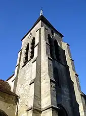 Le clocher est extrêmement sobre, ce qui étonne dans une région qui a vu naître des clochers d'un grand raffinement à la période romane et au début de la période gothique (Auvers-sur-Oise, Champagne-sur-Oise, Nesles-la-Vallée, Santeuil...). Mais les clochers frustes ne sont pas non plus l'exception, comme le montrent les églises du Plessis-Gassot et de Villiers-le-Bel. L'appareil est en moellons irréguliers noyés dans un mortier, la pierre de taille étant réservée aux contreforts et aux pourtours des ouvertures. Chacun des angles est flanqué par deux contreforts orthogonaux, qui se retraitent deux fois par des larmiers présents sur les trois faces (au niveau de la limite des allèges et au niveau des impostes des fenêtres de la nef), et trois fois par des larmiers simples, avant de s'amortir par un glacis formant larmier, au niveau des impostes des baies de l'étage de beffroi. Le rez-de-chaussée présente une arcade bouchée munie d'une petite porte à l'ouest, et une fenêtre en arc brisé au sud, qui est entourée d'un biseau et surmontée d'un bandeau doublement biseauté en forme de sourcil. Le premier étage est aveugle du côté ouest, et percé d'une lancette simple en arc brisé au sud, qui est seulement entourée d'un biseau. Une fenêtre comparable est visible depuis l'intérieur de l'église, du côté nord. L'étage de beffroi est ajouré, sur chaque face, de deux baies plus grandes, qui prennent appui sur un glacis commun, et sont entourées d'un double ressaut chanfreiné. L'on cherchera en vain des colonnettes à chapiteaux, archivoltes décorées et éléments de scansion horizontaux. Comme particularité, un court étage suit à l'étage de beffroi, et présente sur chaque face une petite baie unique, dont celles regardant vers l'ouest et vers l'est accueillent des cadrans d'horloge. Il n'y a pas de corniche. Le toit est une petite flèche en charpente, couverte de tuiles plates.
