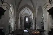 Deux travées de l'église voûtées d'ogives ont été construites au XIIIe siècle. Au XVe siècle ont été ajoutées une troisième à l'est, trois chapelles au nord et deux au sud.