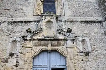 Le portail est de style Louis XIV avec trois niches à statue qui sont vides.