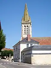 Le clocher est élancé et d'une hauteur considérable, si bien qu'il est visible à des kilomètres à la ronde. Il ne comporte toutefois que trois étages, qui sont séparés par de courts glacis formant larmier. La base, qui contient l'actuelle chapelle des fonts baptismaux, atteint la même hauteur que les murs gouttereaux de la nef. Elle ne présente aucune fenêtre du côté de la façade, mais seulement deux niches à statues vides, surmontées de dais flamboyants. Jadis, elles auraient contenu la statue de saint Pierre, qui se trouve actuellement à gauche de la baie de l'axe du chevet, et une statue de saint Paul qui s'est perdue. Suit un étage intermédiaire, qui atteint la même hauteur que le pignon de la nef. Il est percé seulement d'une étroite baie en arc brisé, cantonnée de deux niches à statues vides, dont les dais ajourés se sont cassés. Chaque niche est entourée d'une guirlande de pampres, et retombe sur un cul-de-lampe orné d'un blason. Roger Gosselin affirme que la guirlande de la niche de gauche serait formée d'épines de blé, mais il est facilement reconnaissable que ce n'est pas le cas. La niche de gauche aurait contenu une statue de saint Vincent, patron des vignerons. Cette statue se trouverait à l'intérieur de l'église. À gauche de la niche, l'on voit un petit cochon (attribut de saint Antoine le Grand) ou un petit chien (attribut de saint Roch) avec un collier autour du cou. La niche de droite aurait abrité une statue de saint Fiacre, patron des jardiniers. Cette statue a disparu[17],[5].