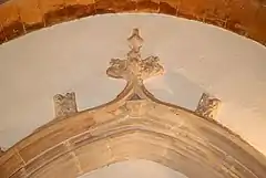 Le mur de gauche est orné d'une baie aveugle surmontée d'un arc en accolade sommé de fleurons de style gothique sous lequel est figuré un petit blason orné d'un calice.