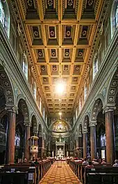 La nef principale est à plafond plat, avec des caissons néo-Renaissance polychromes et dorés. Les arcades de la nef sont soutenues par des colonnes de granit aux chapiteaux décorés de marbre blanc de Carrare. Les bas-côtés sont voûtés. Les peintures de prophètes et de sibylles au-dessus des arcades de la nef ont été conçues par František Sequens. La mosaïque de l'abside représente le Christ Sauveur parmi les saints : agenouillé en dessous se trouvent St Venceslas et Ste Ludmila, sur les côtés se tiennent St Pierre et St Paul, derrière eux St Vojtech et St Prokop. Selon le dessin de Josef Matyáš Trenkwald, ils ont été fabriqués par un atelier de mosaïque d'Innsbruck. Dans l'abside de la nef nord se trouve une peinture du Couronnement de la Vierge Marie de Maxmilián Pirner, réalisée selon la technique de l'encaustique. Dans l'abside de la nef sud, Zikmund Rudl peint l'Ascension du Seigneur selon la même technique. Les motifs de vitraux dans les fenêtres sont conçus par Francis Sequense, qui a également peint le retable de la Vierge Marie, une copie d'une icône paléochrétienne de la basilique Sainte Marie Majeure à Rome. L'architecture de la chaire et de l'autel est sculptée dans du marbre blanc d'Istrie[6],[3].