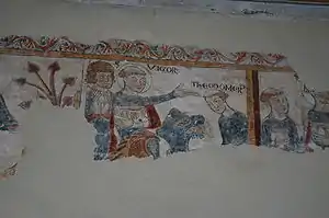 - Les fresques datent du XIIIe siècle et se trouvent dans le chœur. Les fragments conservés représentent la vie de saint Vigor et la résurrection des morts. Ces peintures sont mentionnées dans les annales de l'abbé Quinton à l'occasion de travaux en 1838. Des sondages ont été entrepris en 1977 et 1983 ; le retable a été démonté puis transféré pour permettre le dégagement et la restauration de ces fresques[a 1]. Ces fresques sont parmi les dernières à représenter un récit.