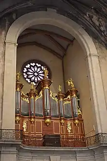 C'est en 1737, que les marguilliers de Saint Vincent décident d'acquérir un orgue dont la construction est confiée au facteur toulousain, Christophe Moucherel. Le buffet est surmonté de cinq tourelles avec à chacun de leur sommet des statues de deux grands anges musiciens et au centre la statue de saint Vincent. De part et d'autre du clavier, sur les soubassements, des trophées d'instruments de musique (flûte, luth, tambourin, etc.) sont sculptés en bas relief. Il a été classé monument historique en 1984[5]. Ces grandes orgues viennent d'être tout juste restaurées avec le concours de la Ville de Carcassonne. Henri Ormières en est l'organiste titulaire. Il préside l'association « Orgues en Bastide Saint-Louis et Barbacane » qui organise depuis 1999 le festival « Les Vents d'Anges »[6],[7],[8].