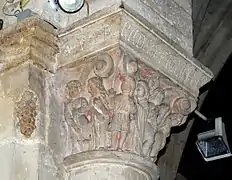 - Chapiteau 5 La corbeille est sculptée sur les trois faces. Chaque dé est supporté par la tête allongée d'un homme. Aux angles pendent deux reliefs ovoïdes, peut-être des pignes.