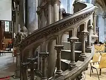 La chaire à prêcher aurait été sculptée par Comparat, sous la direction de Joseph-Étienne Malaval. Elle est soutenue par quatre colonnes dont les chapiteaux sont ornés des symboles des quatre évangélistes (Ange, lion, bœuf et aigle). La chaire elle-même est ornée de cinq hauts-reliefs : les trois symboles de la Trinité encadrant les armoiries du pape Léon XIII et celles de Mgr Foulon[5].