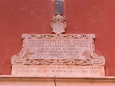 Ecclesia fundata / et erecta in solo Sacrota / Lateran. Papalis ecclesiae / sub annuo censu / unius librae cerae / elaboratae / sub dominio / et lurisditione / Illmi et Revmi / Capli Latersis