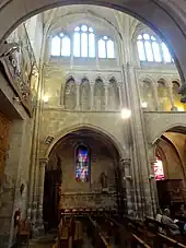 Pour venir aux murs hauts au niveau de l'étage du triforium, leur nudité est compensée par une largeur réduite des murs et donc un rapprochement des supports rythmant les murs, et surtout par une meilleure régularité. Une régularité existe quand même : la dernière travée est moins profonde que les trois précédentes. À partir du bandeau qui marque le début de l'étage des fenêtres hautes, les colonnettes correspondant aux formerets manquent au début de la troisième travée. Les formerets retombent ici sur des consoles, et tous les formerets subsistent, bien que sans emploi. Les voûtes du XIXe siècle ne peuvent pas les réutiliser, car étant établies sur des croisées d'ogives simples, mais l'emploi d'un profil anachronique traduit aussi l'absence de volonté de reconstituer la disposition primitive. Les fenêtres sont à trois lancettes trilobées dans la troisième et la quatrième travée, et à trois formes à cintre surbaissé dans la cinquième et la sixième travée. Elles sont toujours surmontées d'un ovale et de deux demi-ovales. En haut du chevet, l'on trouve deux fenêtres au remplage Renaissance standard de deux formes en plein cintre surmontées d'un oculus. Partout les pourtours ont été refaits, et le remplage se trouve ainsi engagé dans les murs, même là où les meneaux d'origine ne subsistent plus. Ceci montre qu'il y a eu des réparations importantes à deux reprises : d'abord réfection du remplage, puis réfection des murs sans toucher au remplage des fenêtres.