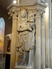 - La statue grandeur nature en pierre calcaire de la Vierge à l'Enfant, haute de 178 cm et datant du second quart du XIVe siècle, à gauche de l'entrée du chœur. L'on suppose qu'elle est issue d'un atelier parisien, et l'hôpital de Senlis en possède une semblable. La statue est entièrement enduite de peinture blanche et a été partiellement dorée à l'époque moderne, ce qui cache un peu son âge[20]. Le beau caractère de cette statue est à souligner[19].