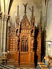 - Le confessionnal néogothique en bois de chêne sculpté date de 1852, mais a été offert en 1888 seulement par Madame Pain, bienfaitrice de la paroisse. C'est un meuble de grande qualité. Des statues de saint Louis et de Marie-Madeleine sont logées dans des niches de part et d'autre de la loge centrale. Leurs dais sont sommés de fleurons et couronnés par de haut pinacles. D'autres pinacles se situent aux quatre extrémités du confessionnal. Le gâble central présente l'effigie du Christ, et il est surmonté d'un ange qui trône en hauteur. Les rinceaux ajourés sur les rampants ne concordent pas avec le style général. Sur les loges, le décor en hauteur est constitué par de petites tours crénelées aux angles, et par des arcatures plaquées. Les portes sont couvertes de nombreux quatre-feuilles s'inscrivant dans des lancettes en tiers- point. Le grand quatre-feuilles au sommet contient une croix pattée. Sur la partie basse de la porte centrale, l'on note quatre arcades trilobées surhaussées[24],[25].