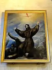 - Le tableau peint à l'huile sur toile, intitulé « l'Extase de saint François », mesure 222 cm de hauteur et 194 cm de largeur sans le cadre. Longtemps vu une copie d'une œuvre de José de Ribera (Ribera l'Espagnolet, 1591-1652), le tableau est aujourd'hui attribué à Luca Giordano[21]. Il a été offert par le baron d'Erlanger le , et présenté à l'époque comme un original de « grand prix ». Le tableau bénéficie de soins de restauration en 1994, avec remise sous tension de la toile et restauration picturale[22],[23].