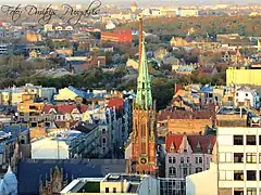 Le clocher de l'église a une forme progressivement rétrécie vers le haut, il mesure 63 m de haut et sa flèche est recouverte de cuivre. La brique rouge est utilisée pour les murs extérieurs et les éléments architecturaux sont coulés dans le béton.