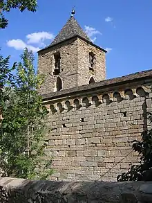 L'église est érigée en appareil soigné. Le clocher s'élève sur un plan carré au-dessus de la chapelle du côté sud de la nef. La partie basse du clocher, d'époque romane, date du XIIe siècle, les deux étages supérieurs furent renouvelés en période gothique. Le long de la partie supérieure de la nef et de l'abside court une frise d'arcatures lombardes appuyées sur des modillons.