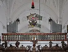 Sur la paroi de la tribune se trouvent, entre les fresques, deux blocs de grès armoriés. Le plus méridional porte l’nscription latine Chorum istu(m) et altare nobil(e) et valid(um) Georgi(us) Gossenprait de Hohenfreiperg et Radgunda Eggen(n)bergeri(n) uxor ei(us) fundaverunt An(n)o d(omi)ni 15(12)[15]. L’autre montre les armes des comtes Waldbott von Bassenheim et les mots Sub comitibus de Waldbott-Bassenheim MDCCCVI-MCMXXVI. Ces blocs armoriés se trouvaient initialement sur les autels de la tribune, ils ont été déplacés à cet emplacement en 1956[16].