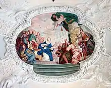 Dans la partie supérieure du quadrilobe, on voit à gauche, dans des couleurs pastel, le Saint-Esprit sous forme d’une colombe entourée de rayons, d’où partent des flammèches en direction de Marie et des douze apôtres qui l’entourent. Un putto à droite, à côté de la colombe, soutient un rideau vert drapant deux colonnes torsadées blanches, et retenu par une corde dorée. Tout à droite se tiennent deux disciples, levant respectueusement les yeux vers le ciel ; à côté, trois autres prient agenouillés, également avec le visage levé. Trois marches d’escalier ferment la scène vers le bas. Sur la quatrième marche, Marie est assise en vêtement blanc et manteau bleu. À sa gauche se trouvent cinq apôtres. Tous regardent vers le haut, l’un d’entre eux, ébloui, lève la main pour se protéger les yeux. Tout devant est assis Simon-Pierre, derrière lui, l’apôtre Jean. Les trois disciples au premier plan portent des habits de couleurs plutôt vives, vert, rouge, jaune et bleu. Les personnages à l’arrière sont en couleurs pastel. Au centre, deux femmes se joignent au groupe. À droite de Marie se tiennent les deux derniers disciples, eux aussi en couleurs pâles, au-dessus desquels on observe une balustrade blanche.