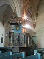 La chaire est sculptée par Daniel Sudrovius en 1662 sur le modèle de la chaire de la cathédrale de Turku. Les bancs datent des années 1870, la balustrade d'orgue et l'autel des années 1980.