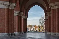 Située dans l'axe central du cimetière, l'église au plan carré est surmontée d'une coupole double centrale flanquée et deux petites coupoles. L'édifice central est relié au nord et au sud à la salle de bénédiction et de mise en bière par des passages à arcades. Les façades latérales comportent d'imposantes fenêtres circulaires. À l'intérieur de l'édifice, les statues des quatre évangélistes ornent l'espace sous la coupole.