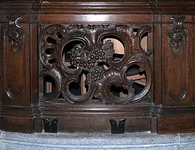 Les lambris en chêne du chœur sont ornés de figures d'anges qui s'en détachent. Ces lambris se prolongent sur les ces colonnes qui encadrent l'entrée du chœur, et qui portent une statue en bois polychrome de sainte Barbe, à gauche, et de saint Éloi, à droite.