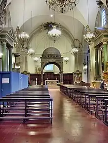 L'intérieur, d'aspect baroque, est grand, en forme de croix latine, avec une seule nef se terminant par une abside polygonale. Le toit est constitué d'une voûte croisée. Les parois latérales de la nef sont rythmées par la présence d'autels avec des peintures et sont animées par les beaux stucs d'Agostino Silva. Parmi les peintures du XVIIe siècle, se trouve la peinture des Stigmates de Saint François de Giacomo Giorgetti. À l'entrée de l'église se trouve un autel romain en marbre (Ier siècle av. J.-C.) réutilisé comme bénitier. L'église possède également un beau sol en majolique de Deruta (seconde moitié du XVIe siècle). À noter La Pietà de Spello du Pérugin. À l'origine, l'église possédait de nombreuses chapelles, pour la plupart fermées et murées ; certains restent visibles : la chapelle Baglioni, avec des fresques de Pinturicchio[3], la chapelle du Saint-Sacrement qui abrite un tableau de Pinturicchio et deux autres situées aux extrémités du transept[4].
