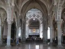 Le premier architecte en est Guiniforte Solari. L'intérieur est constitué de trois nefs, séparées par une série de colonnes en granit, avec des chapiteaux corinthiens, d'où s'élancent des voûtes d'arêtes « à la forme ogivale peu accentuée [2]».