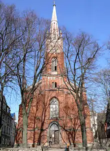 Le bâtiment a été construit dans un style néo-gothique en briques. La façade principale avec portail et clocher fait face à la rive de la Daugava. Les vitraux ne montrent que des vestiges de motifs religieux, car ceux-ci ont été supprimés pendant la période soviétique.