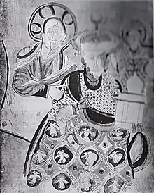 Le roi porte une couronne d'or marquée du sceau de Salomon, elle est surmontée d'un croissant. Le personnage est très richement vêtu, sa tunique est ornée d'aigles à deux têtes. Il tient un sceptre dans sa main droite et une maquette de l'église dans sa main gauche. Le Christ, d'une taille plus imposante est placé derrière lui et semble le protéger. Cette représentation rappelle celle présente dans les chapelles de l'église de Banganarti et étudiée par Magdalena Łaptaś[11]. Un deuxième personnage apparaît à sa gauche, également nimbé, il s'agit probablement d'un saint, il lève le bras droit comme pour demander la parole et son bras gauche porte un bouclier. Une inscription attenante semble désigner le personnage central comme l'Eparque de Nobatie[12],[13].