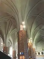 La tour ouest de l'église médiévale, construite en pierre grise, à coupole baroque, et la salle d'armes ont apparemment été construites à la fin du XVIIIe siècle. Les grands piliers octogonaux divisent la nef en trois vaisseaux de mêmes dimensions. Le décor moderne du chœur date des années 1960[2]. Les vitraux sont l’œuvre de Gunnar Forsström.