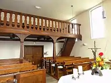 L'accès à l'église se faisait par la porte donnant sur la rue et on entrait dans l'école par une porte latérale. Le logement de l'instituteur se trouvait au premier étage. Le bâtiment a été rénové en 1987. Désormais on pénètre dans l'église par l'ancienne salle de classe sur le côté. Quoique orienté différemment, le mobilier est d'origine. Les vitraux sont neufs, l'orgue date de 1977.