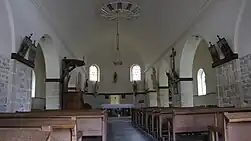 À l'intérieur la nef est composée de quatre travées avec des arcs en plein cintre séparées par des piles carrées aux dimensions irrégulières.