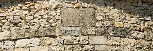Au-dessus de cette inscription, dans la zone de maçonnerie refaite en moellon, est encastrée une pierre portant deux inscriptions, dont la première est extraite du psaume de David et la seconde a un sens obscur :