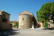L'église possède un chevet semi-circulaire érigé sur un soubassement réalisé partiellement en moellon et partiellement en pierre de taille. Le chevet, séparé du soubassement par un cordon et une moulure, est réalisé en pierre de taille sauf la partie haute de la maçonnerie, réalisée en moellon, signe d'une modification du couronnement. Des blocs de pierre rose de Montpezat sont incorporés par endroits dans la maçonnerie.