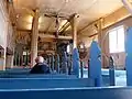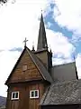 Le cimetière de l'église s'étend à côté. Le clocher, en bois également, est distinct de l'édifice.